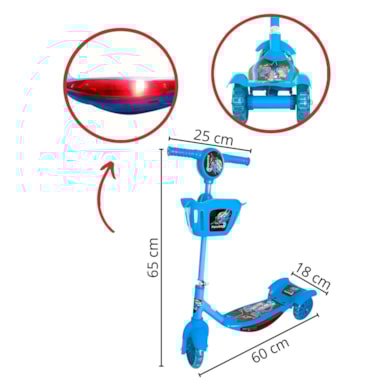 Perfeito para se divertir em diferentes lugares, por ser leve permite um fácil transporte e garante a diversão. Possui luz no chassis que são acionadas com um botão, além de possuir som de música o que deixa seu passeio de patinete muito mais legal. Possui três rodas sendo a roda dianteira de 6" e rodas traseiras de 5" e sistema de freio duplo acionado com o pé na roda traseira garantindo a segurança do seu filho.